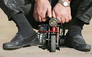 在德國萊比錫舉行的摩托車展示會上 ,一名騎著普通摩托車的女子觀看一輛2公斤重的迷你摩托車 。這種摩托車隻有人腳大小 ,時速卻可達到20公裏 。